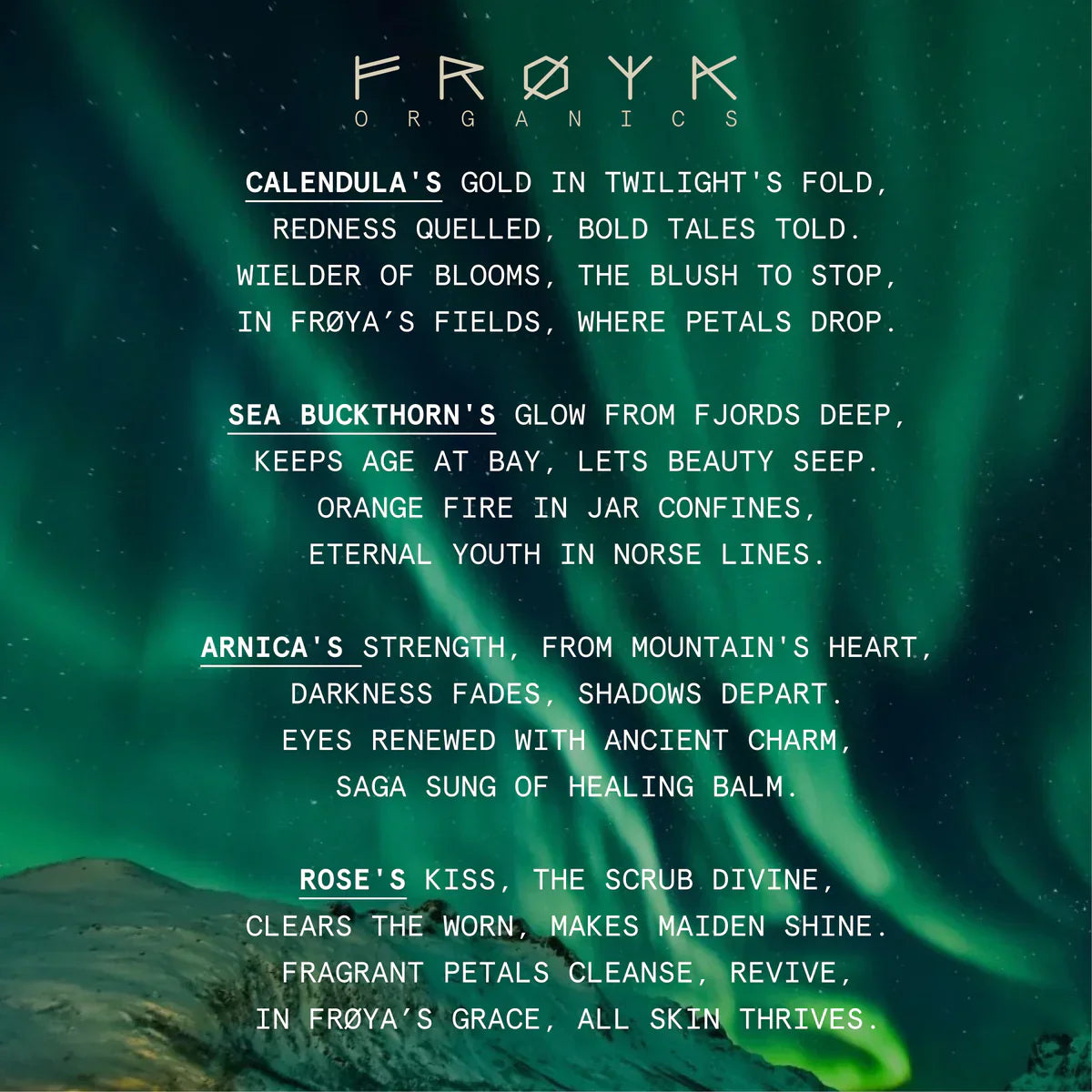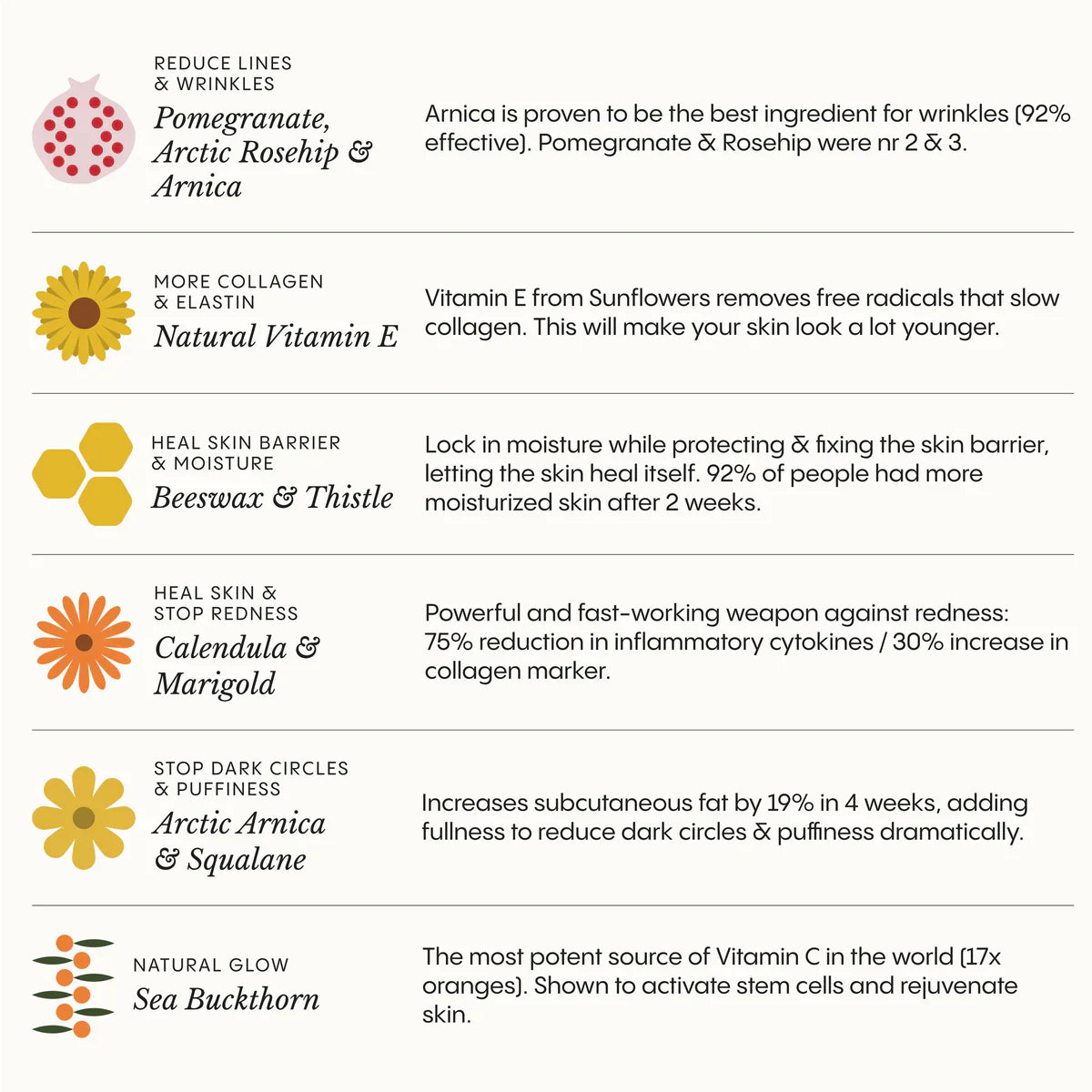 ingredients were tested on humans for anti-ageing and our main ingredient Arnica was proven most effective (Study). We source it wild on the Norwegian mountainside to capture the maximal antioxidant potential